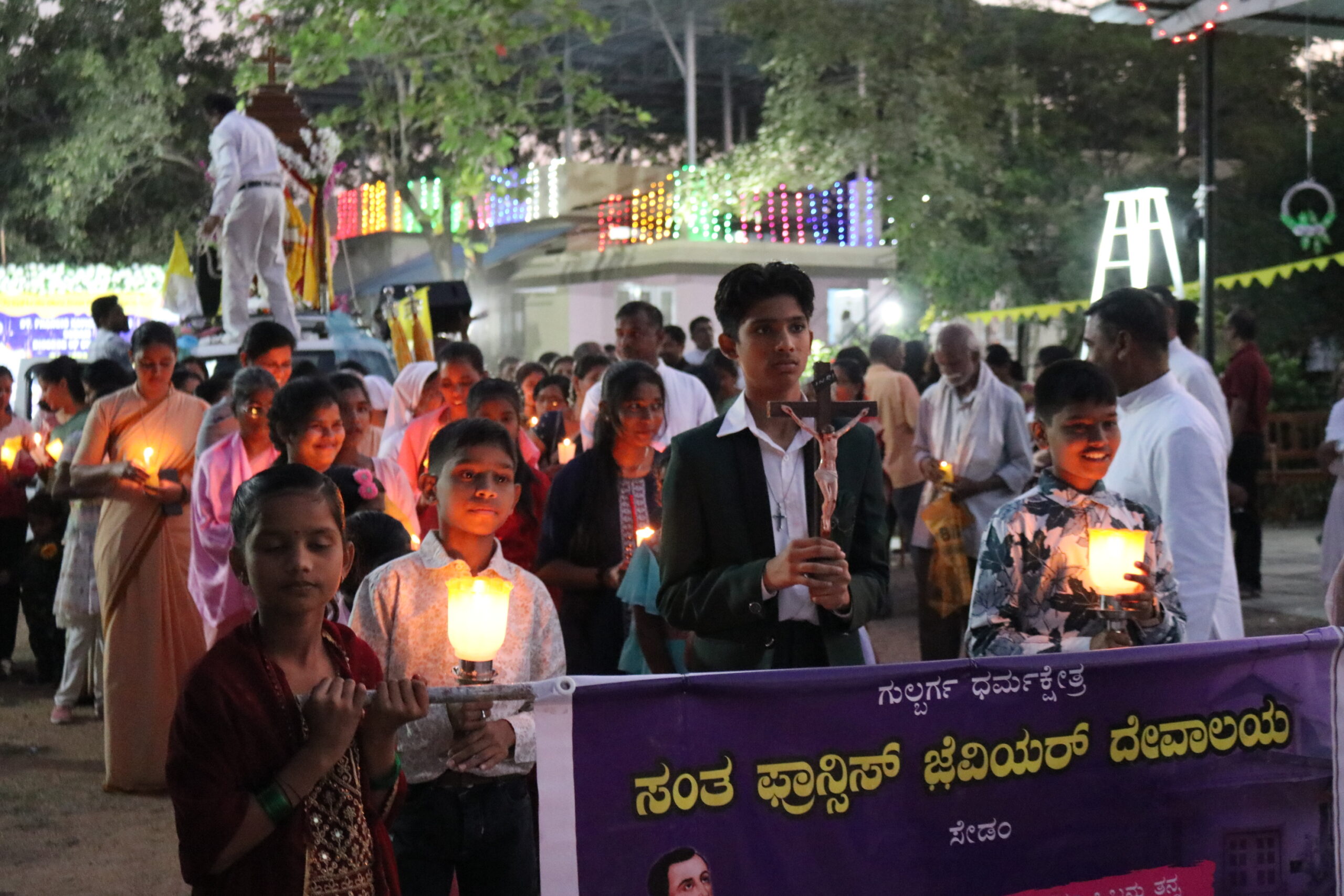 Fr. Norbert Fernandes, SJ, Fr. Arogya Swamy, MSFS, and Fr. Selvaraj, MSFS. Deanery priests, religious sisters, and a large number of lay faithful were also present to witness this significant milestone. A solemn procession through the nearby colonies marked the celebration. Faithful carried color candles and the statue of St. Francis Xavier, expressing devotion and gratitude. After the procession, Bishop Robert Miranda led the community into a prayerful Thanksgiving Benediction.